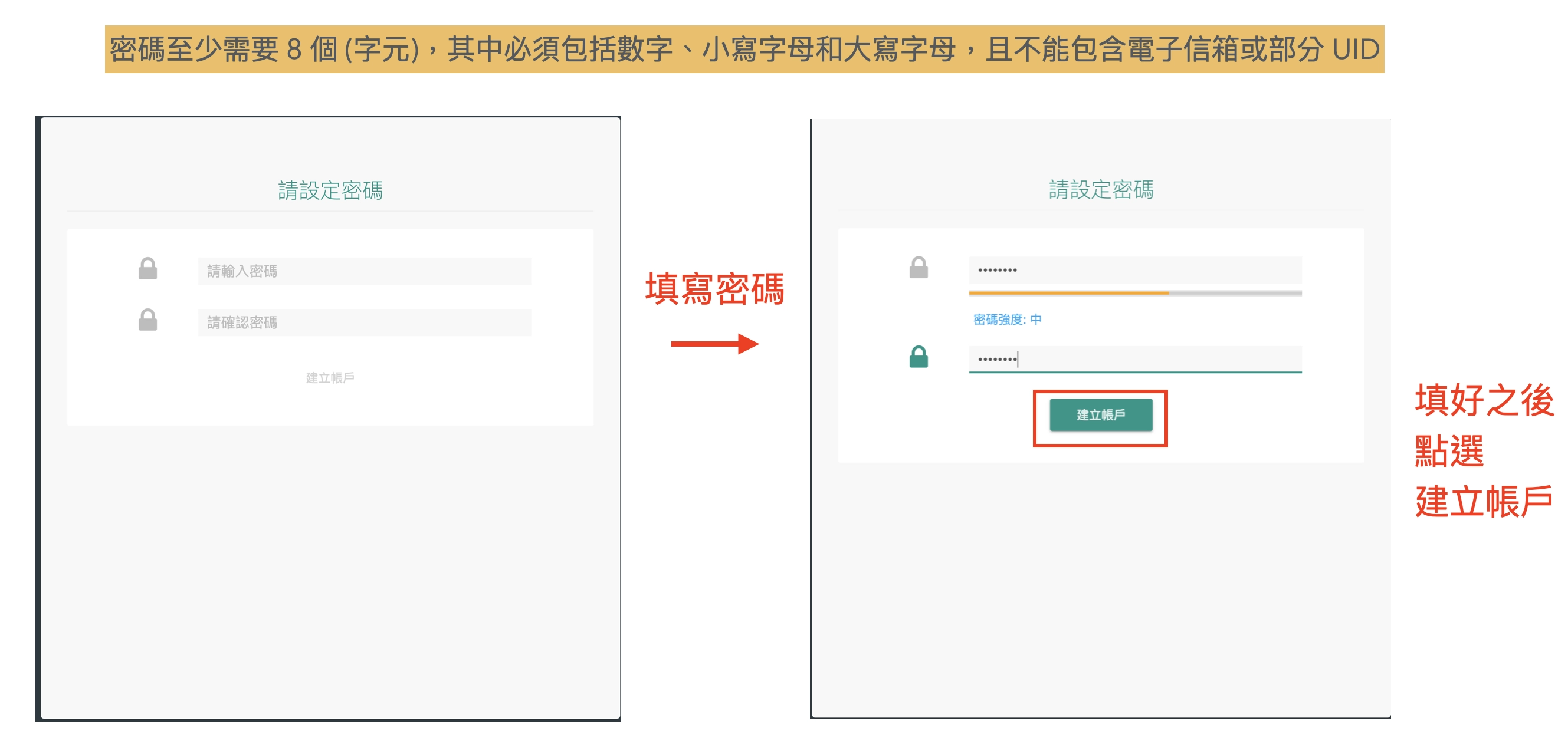 密碼至少需要 8 個 (字元),其中必須包括數字、小寫字母和大寫字母,且不能包含電子信箱或部分 UID
