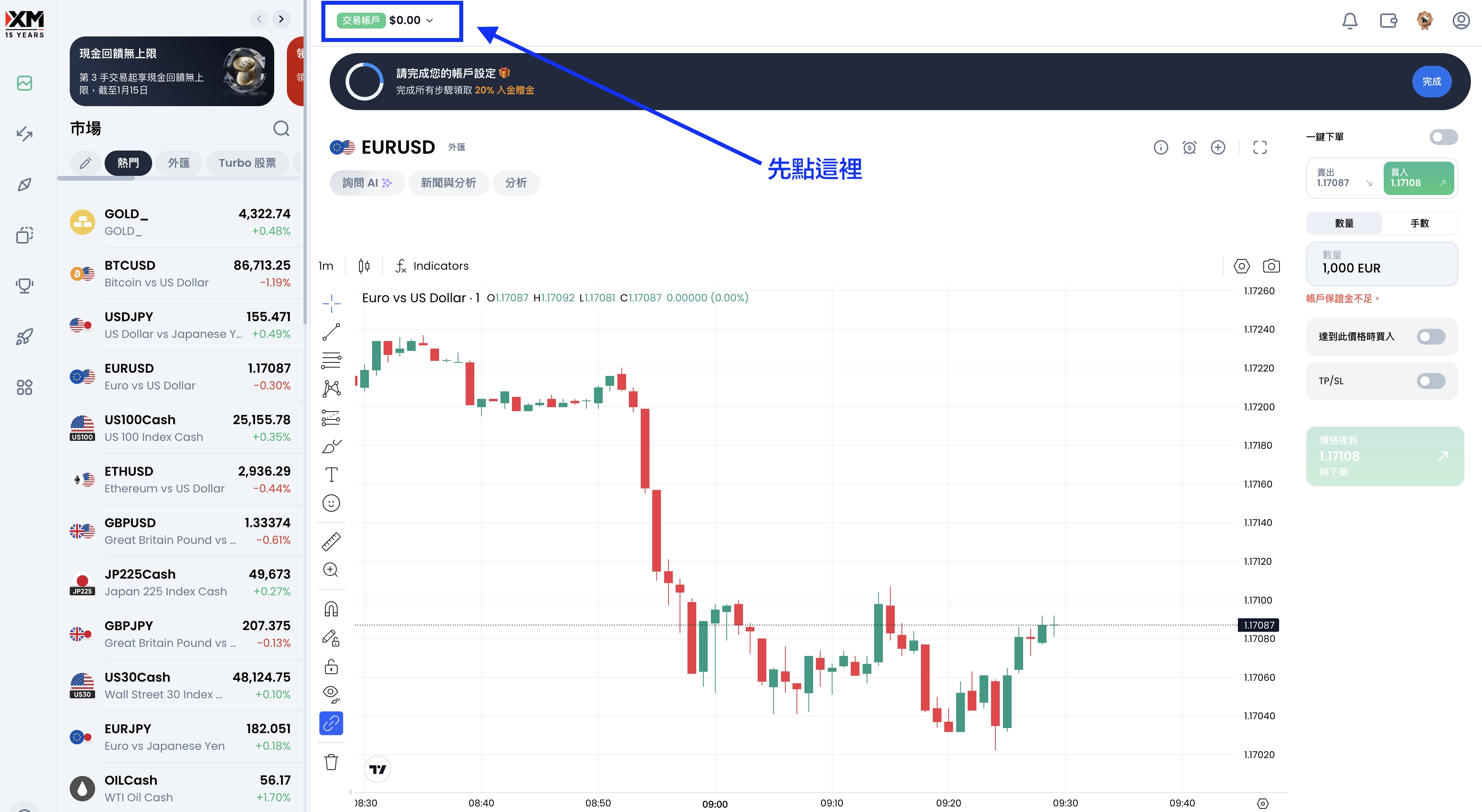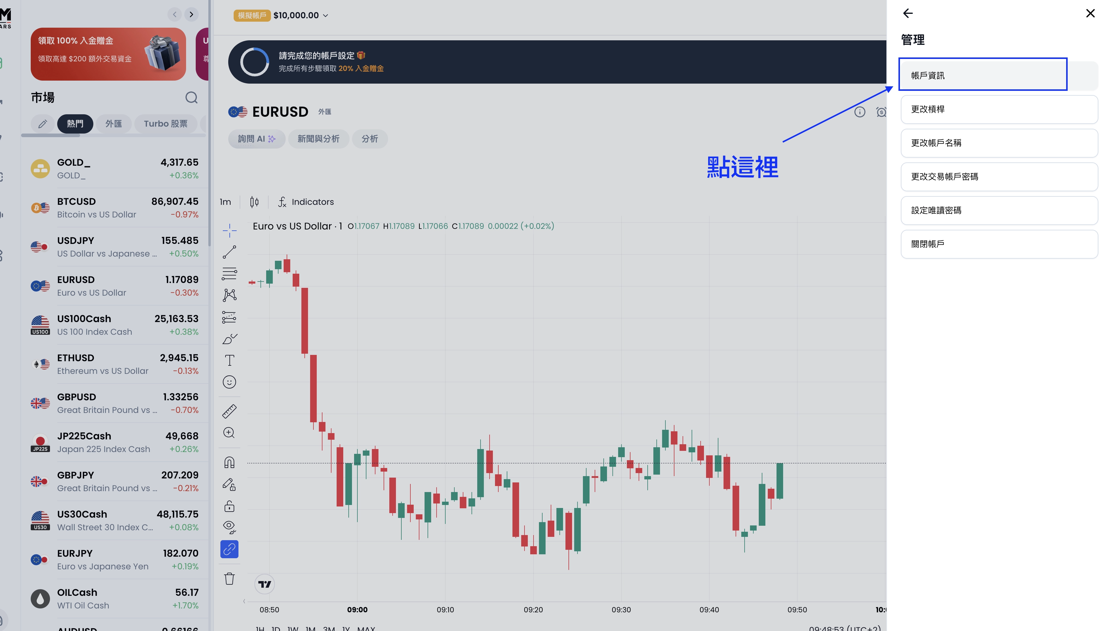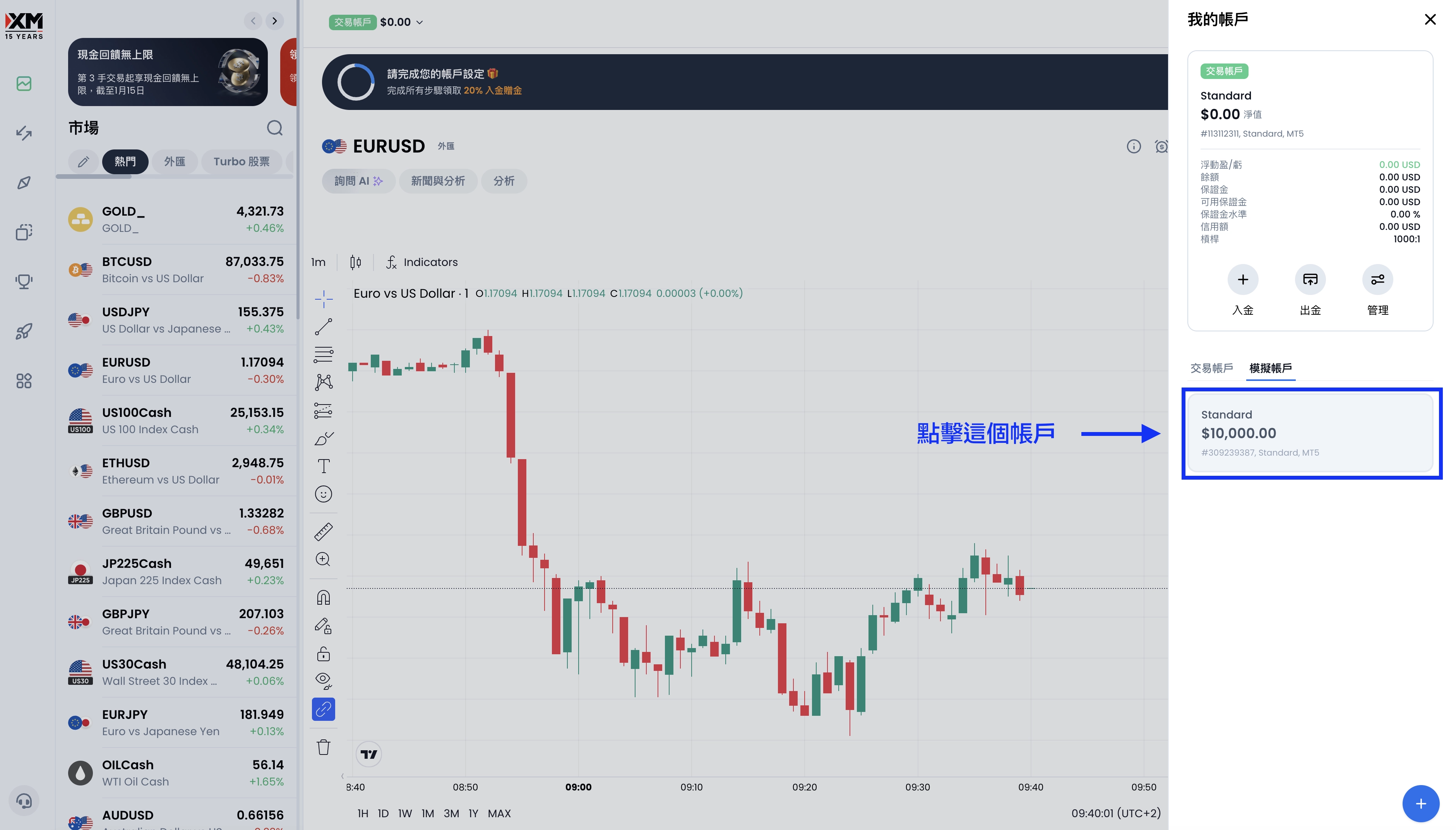然後再一次點擊上方的模擬帳戶位置