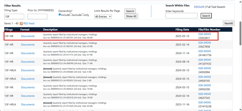 裡面會有很多表格,我們這時候在 Filing Type的地方搜尋【13F】,輸入之後點擊Search