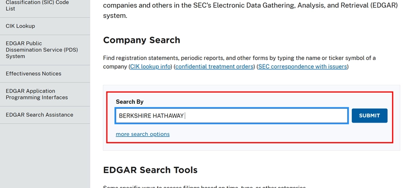 接下來就會出現一個搜尋的畫面,不過要記得巴菲特並不是使用本人帳戶下去投資,而是用波克夏,不過因為是英文網站,所以我們要用英文BERKSHIRE HATHAWAY ,輸入之後,點擊【SUBMIT】
