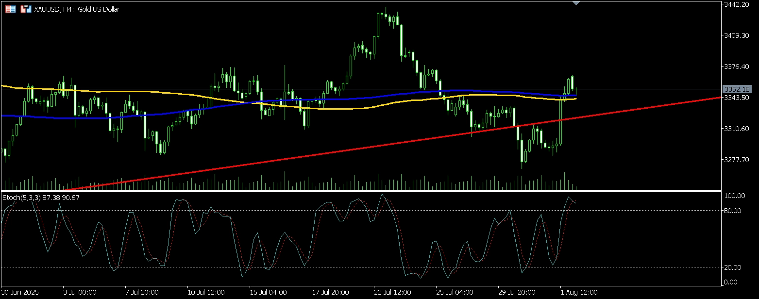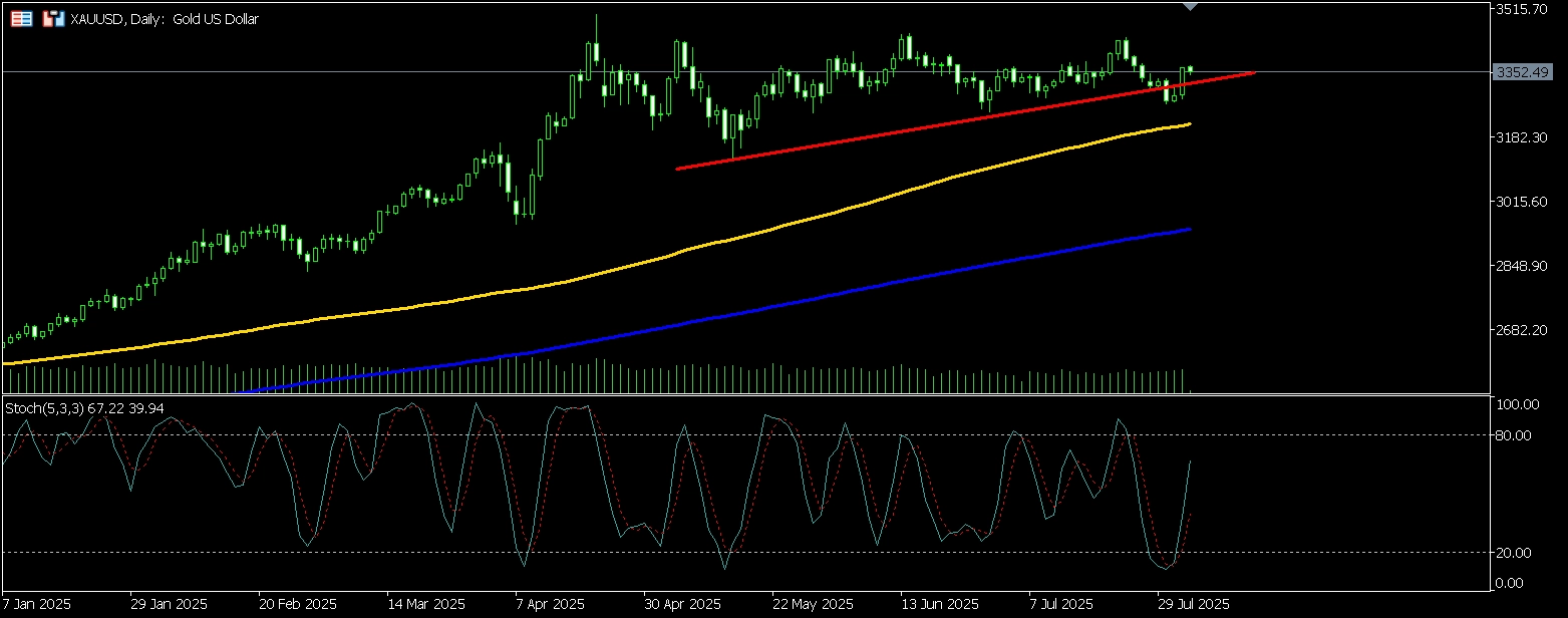 目前黃金價格站上下方趨勢線,顯示上漲趨勢線力道依舊在